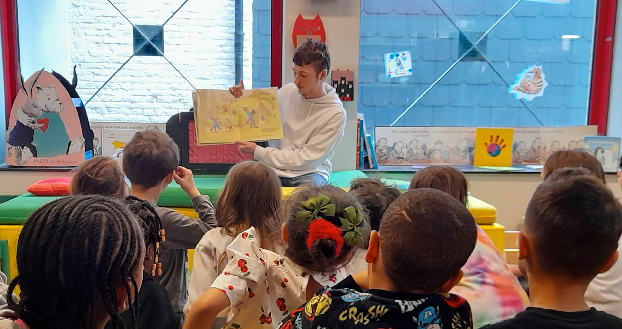 Pratiquement tous les jours, à la bibliothèque, des classes d’écoles primaires des alentours de Jemappes viennent pour une petite activité lecture + emprunter des livres.
