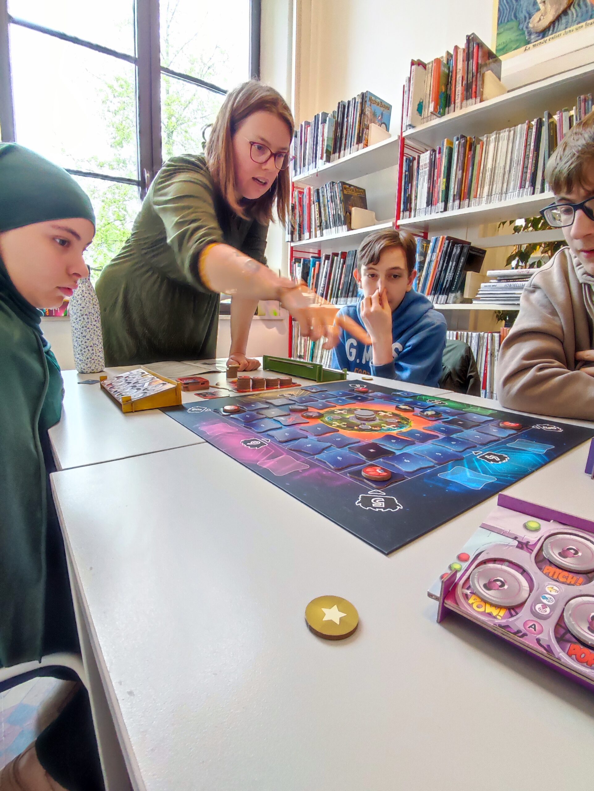 Deux activités « jeux de société » par semaine étaient organisées lors de mon stage : l’une par la Ludothèque toute les semaines avec également des classes de primaires d’écoles des environs ; l’autre par une ancienne bibliothécaire, Jessica Haps, qui revenait avec un groupe chaque semaine pour passer un moment autour d’un jeu de société.