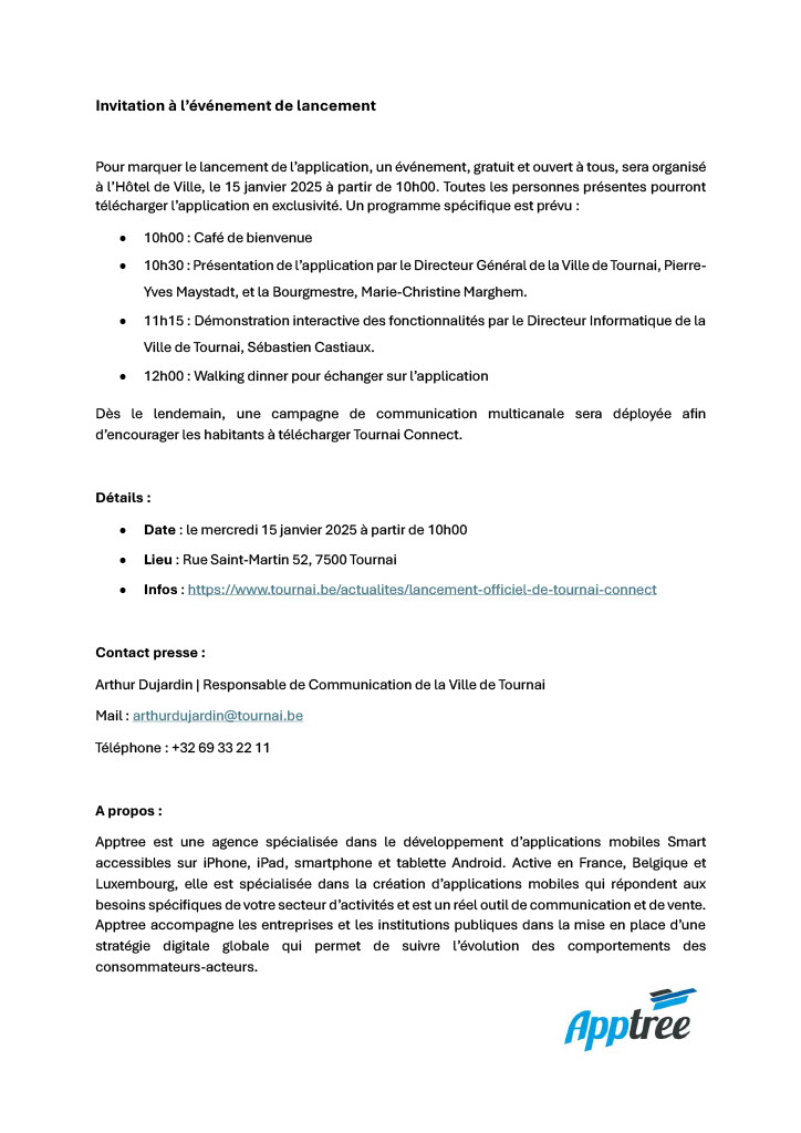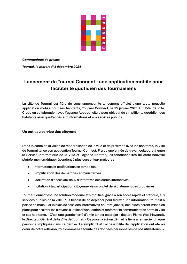Communiqué de presse « fictif » pour le lancement de Tournai Connect, application mobile tournaisienne