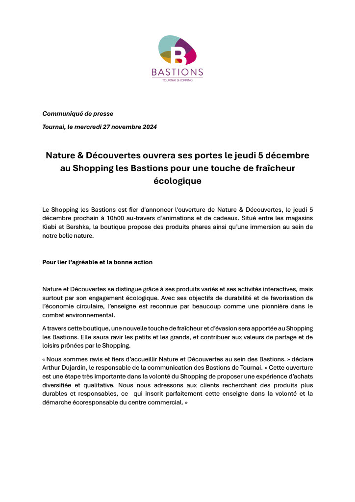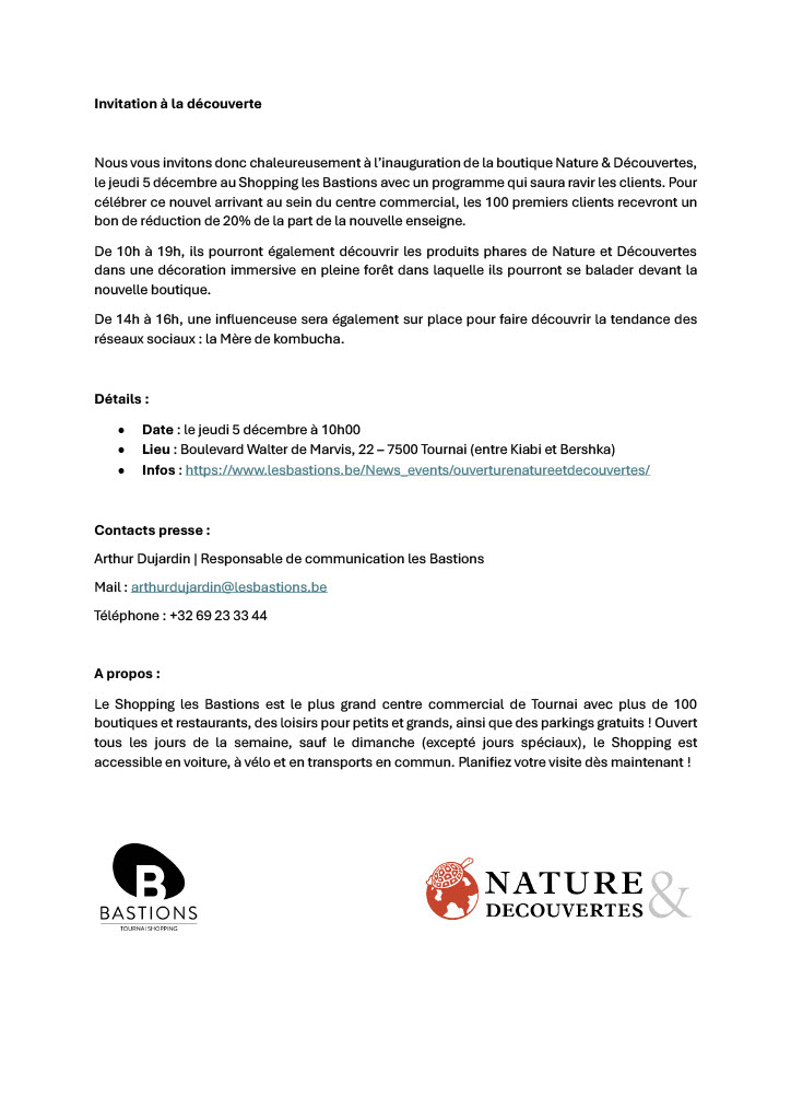 Communiqué de presse « fictif » pour l’ouverture d’un magasin Nature & Découvertes au Shopping les Bastions à Tournai