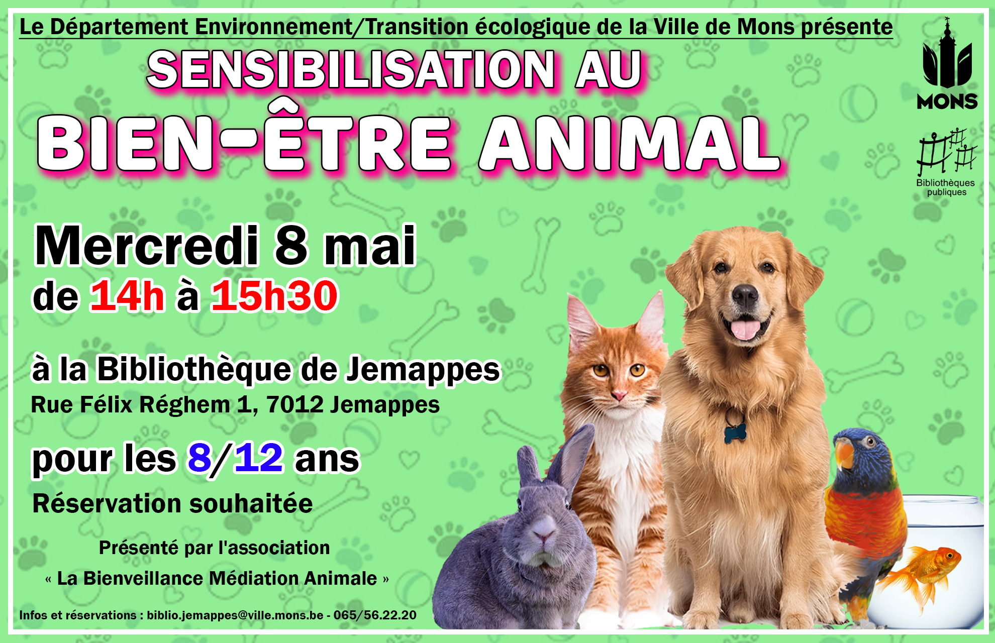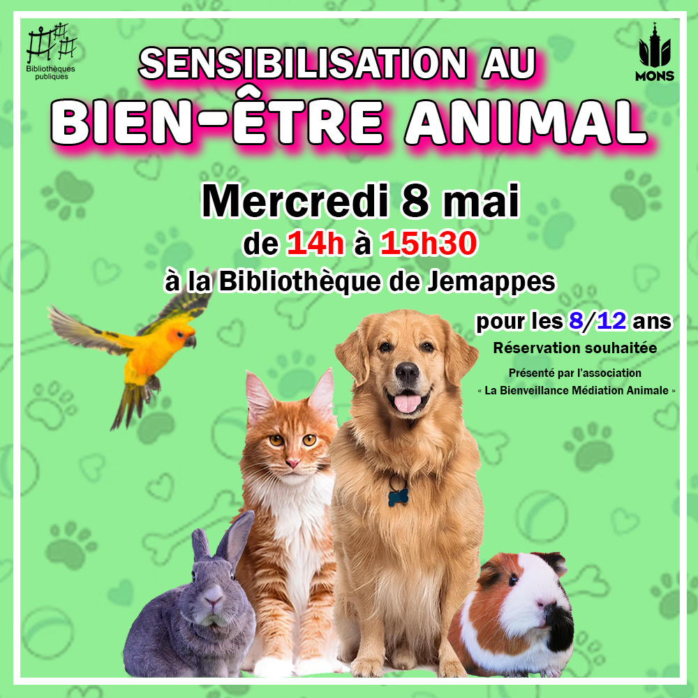 [BIBLIOTHÈQUE JEMAPPES] Le MERCREDI 8 MAI, le département Environnement/Transition écologique de la ville de Mons vous invite à une animation de SENSIBILISATION AU BIEN-ÊTRE ANIMAL. Cette dernière vous sera présentée gratuitement par l’association « La bienveillance...