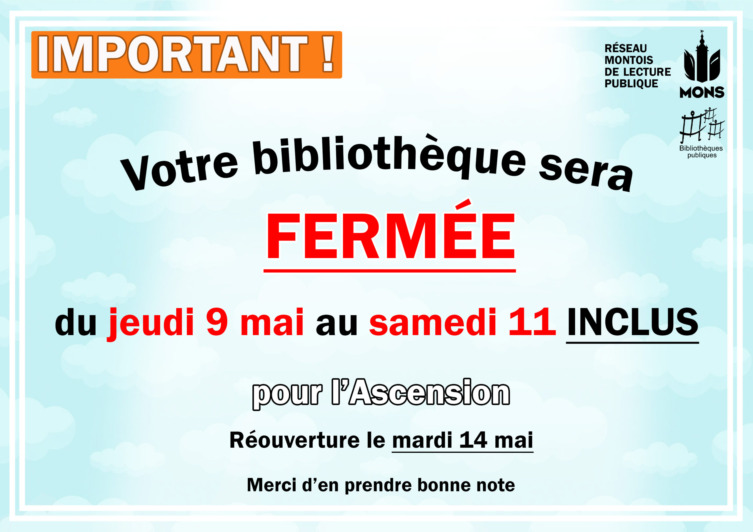 Affiche pour annoncer la fermeture de la bibliothèque durant la période de l’Ascension.