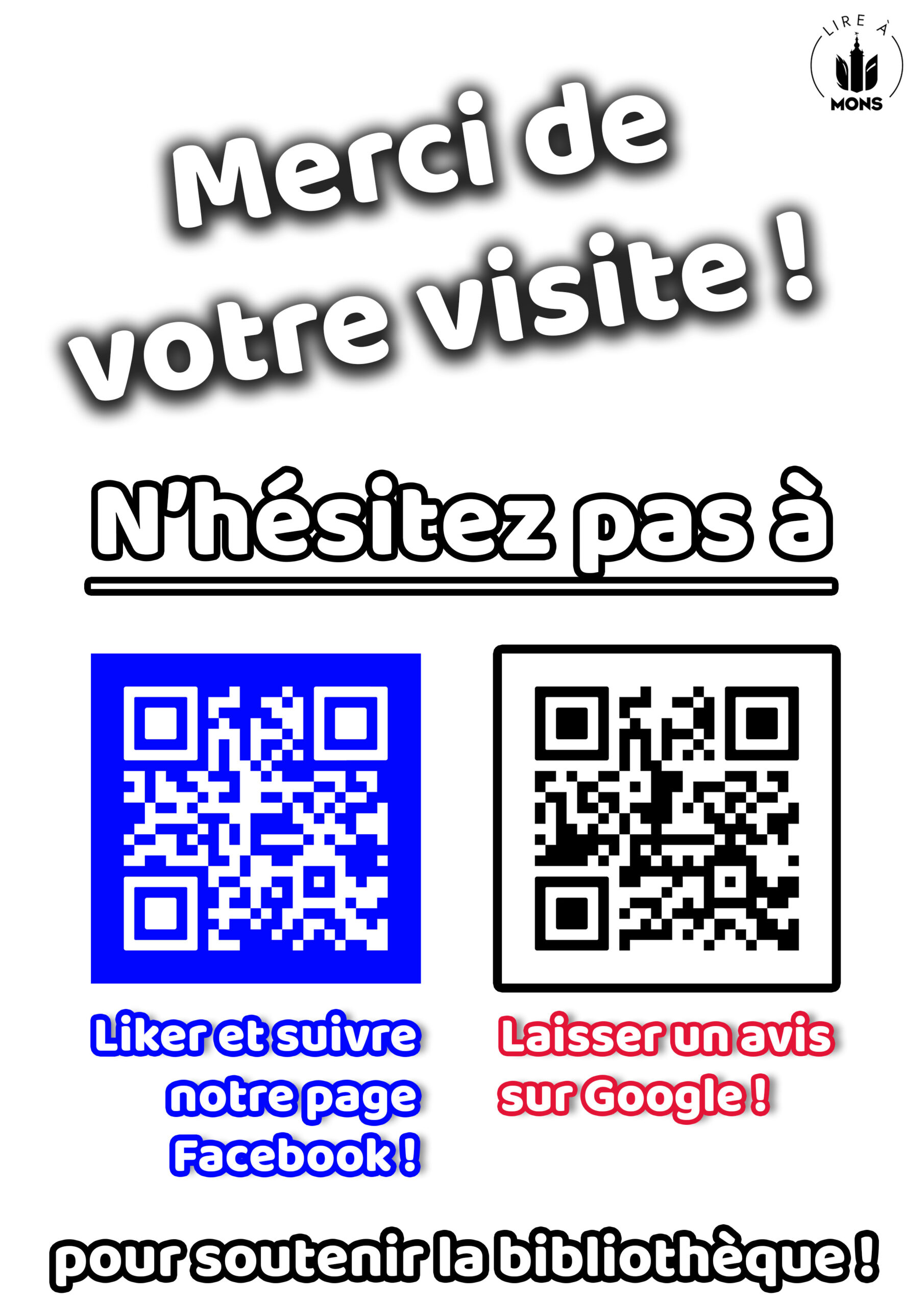 Affiche pour inciter les gens à suivre les informations de la bibliothèque sur ses réseaux sociaux et laisser des avis sur leurs passages, au moyen de QR codes.